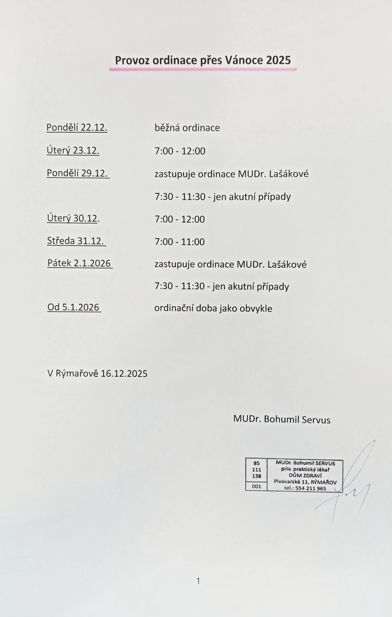 Středa 31. prosince: v době od 07:30 do 10:00 zastupuje MUDr. Bohumil Servus, pouze pro akutně nemocné pacienty