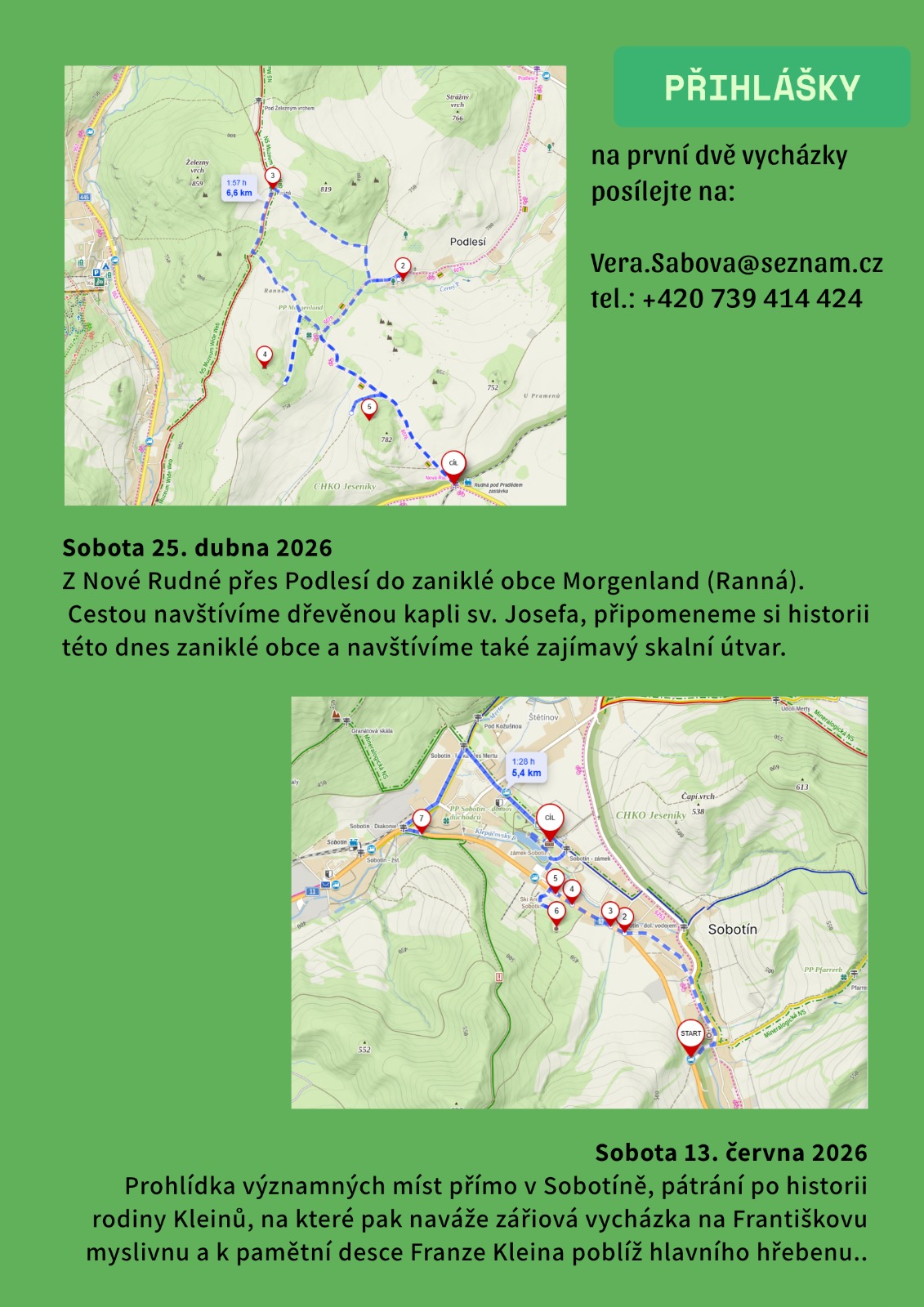Druhá vycházka je připravena na sobotu 13. června 2026 a zaměří se na pátrání po historii rodiny Kleinů a prohlídku významných míst přímo v Sobotíně. Navazovat bude v sobotu 19. září výlet na Františkovou myslivnu a k pamětní desce Franze Kleina.